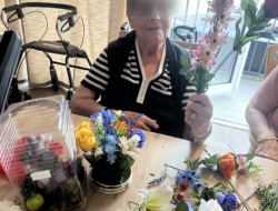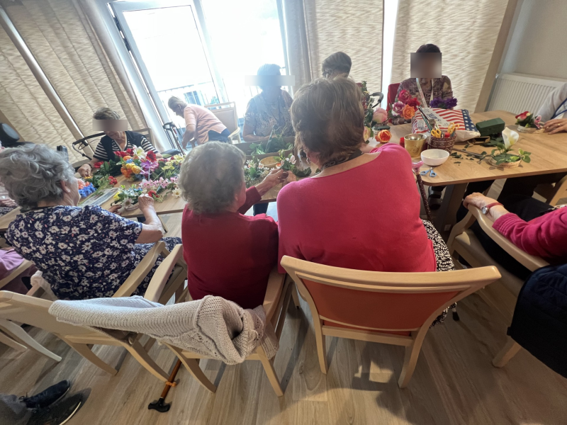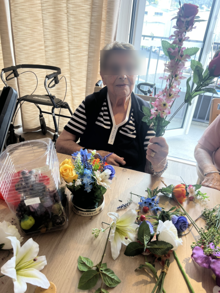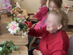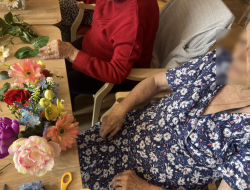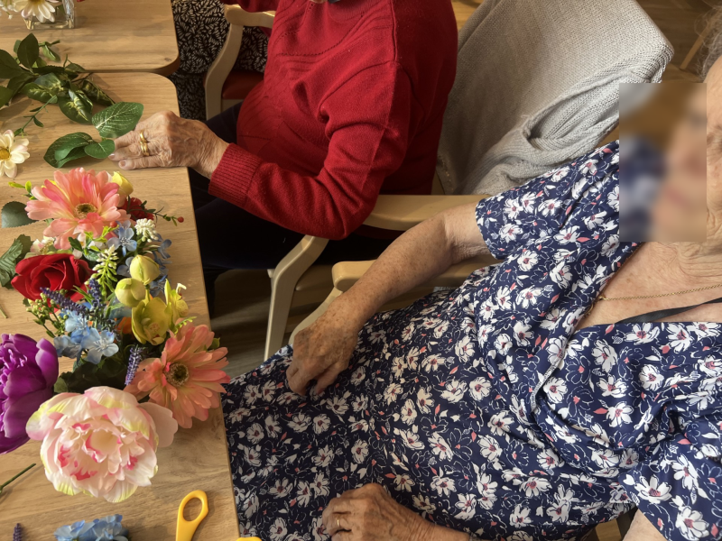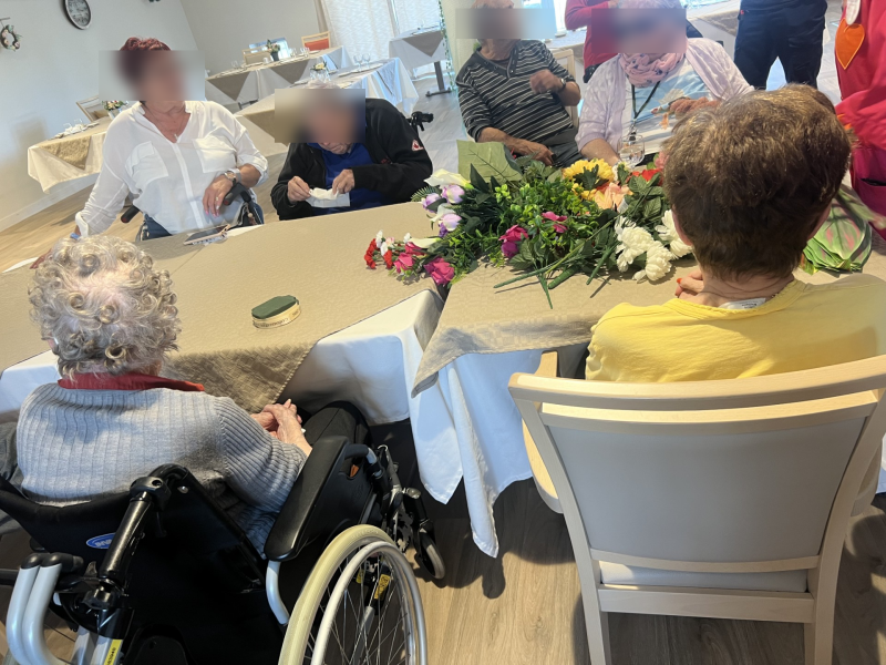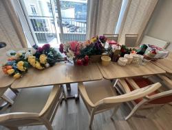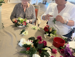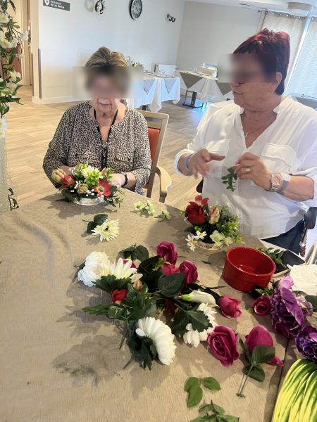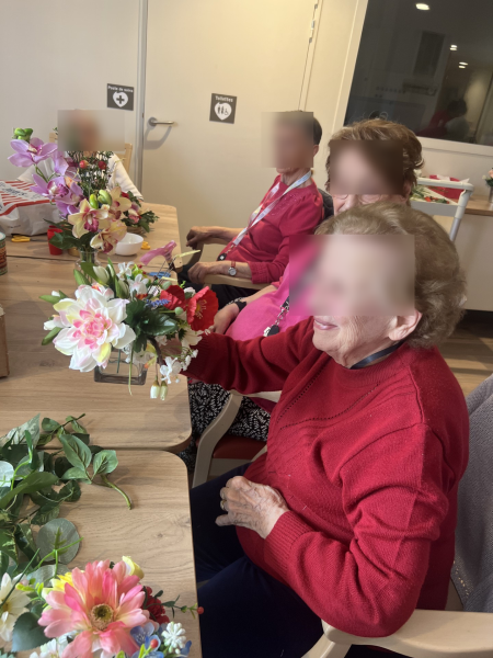 Avec Maeva , notre animatrice et les Blouses Roses , la magie des fleurs artificielles prend vie : des bouquets colorés , des sourires partagés et un souffle de douceur qui éclaire la journée .